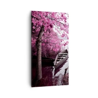 Quadro su tela - Stampe su Tela - Una barca sulla riva di un lago tra alberi rosa - 80x120cm - Nel silenzio rosa - Decorazione murale moderna per soggiorno e camera da letto ARTTOR