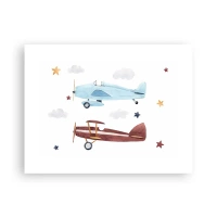 Poster - Aeroplani dipinti a mano su uno sfondo di nuvole e stelle - 100x70cm - Aspettando il pilota - Decorazione murale moderna per soggiorno e camera da letto ARTTOR