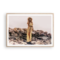 Poster in cornice nera - Una donna in stile boho sullo sfondo di una spiaggia rocciosa - 100x70cm - La magia delle pietre - Decorazione murale moderna per soggiorno e camera da letto ARTTOR