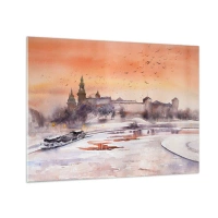 Quadro su vetro - Tramonto sul castello reale e sul fiume in inverno - 70x50cm - Tramonto reale - Decorazione murale moderna per soggiorno e camera da letto ARTTOR